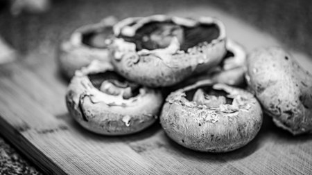 Shallow depth of field (selective focus) details with brown mushrooms (Agaricus bisporus) on a wooden plate ready to be cooked.
