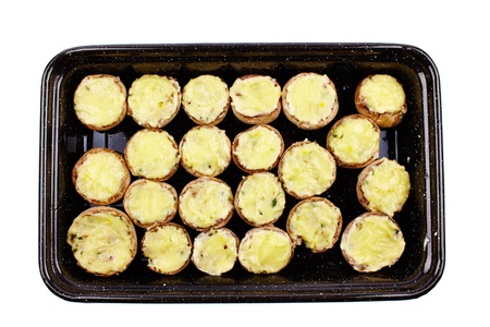 Tray with mushrooms stuffed with garlic, parsley and oil, on the oven rack.