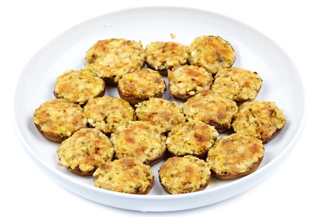 Baked mushroom caps stuffed with fried mushrooms, onion, cheese, and spices.