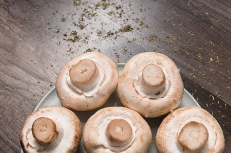 Raw and fresh mushrooms on a gray stone plate, vegetables from an organic farm, natural food