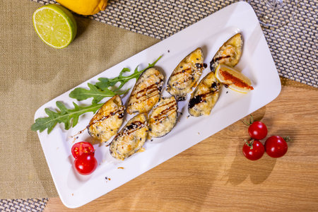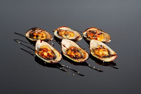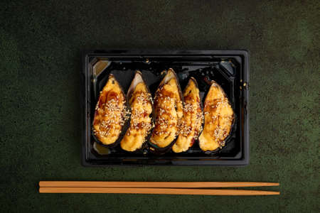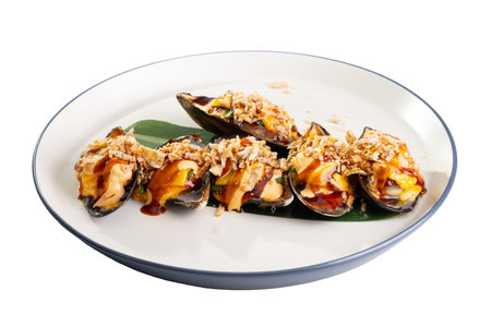 Baked mussel with teriyaki sauce and crispy topping on bamboo leaf on white plate, isolated on white background, closeup seafood appetizer.