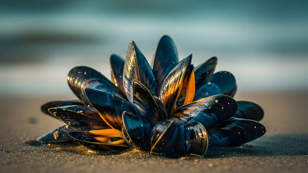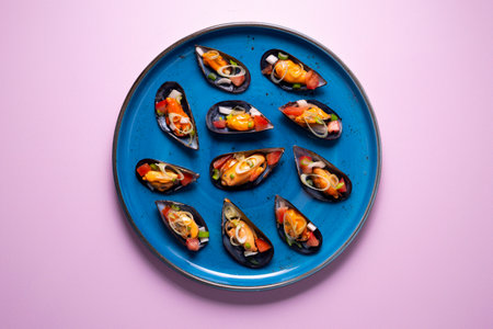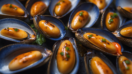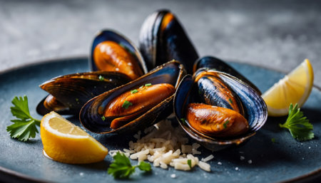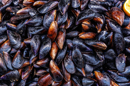 Artful arrangement of fresh mussels, highlighting their deep marine appeal in culinary settings.