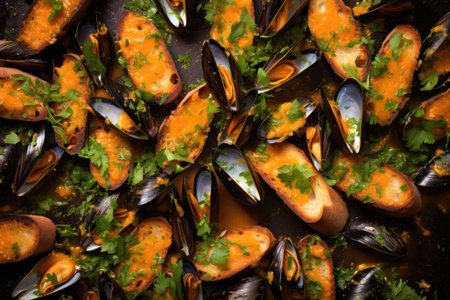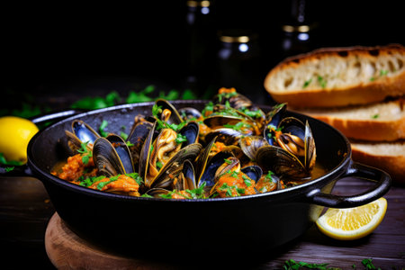 close-up of mussels with parsley and crusty bread, created with generative ai