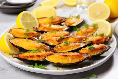 Baked mussels with cheese and lemon wedges, perfect seafood appetizer with a gourmet touch