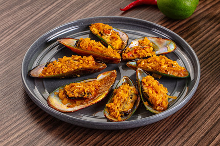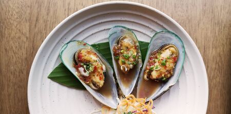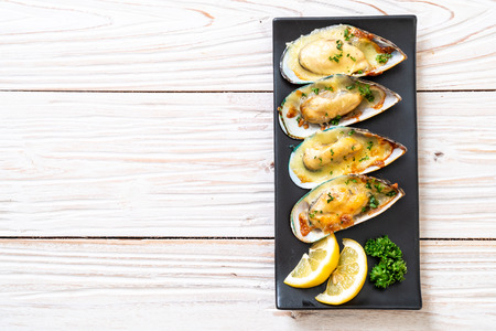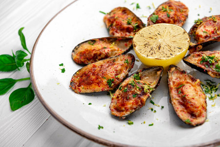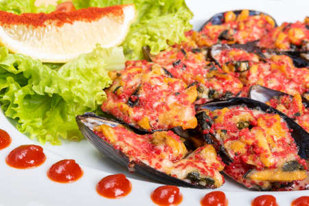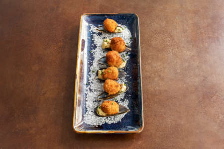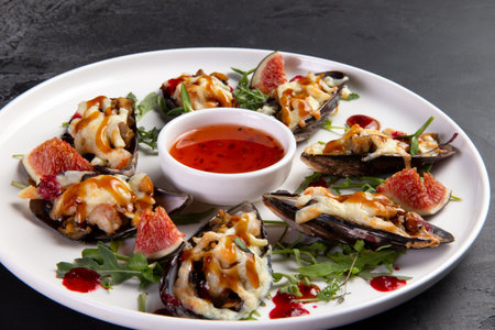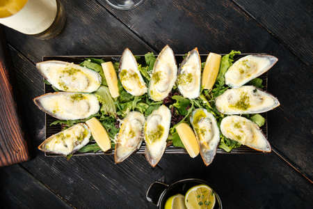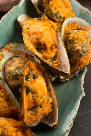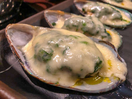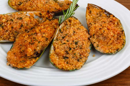 Baked mussels with cheese on plate. Mussels baked in shells with cheese and garlic. Serving food in a restaurant. Photo for the menu