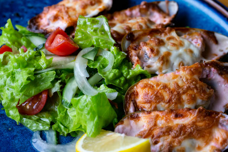 Yummy mussels under cheese with lemon on white plate at restaurant