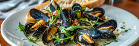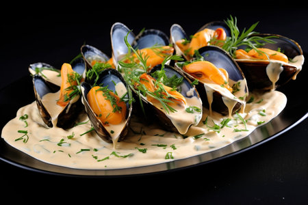 Blue Mussels in Cream Sauce, Delicious Seafood Dish with Prepared Seashells or Mytilus, Fresh Greens and Arugula Close Up, Generative AI Illustration
