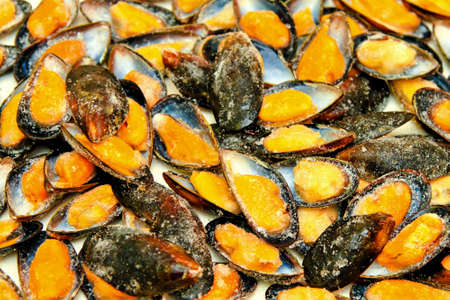 Too soft, fresh mussels in the market at Thailand. Green mussels abstract background. seafood on ice.