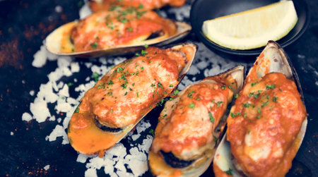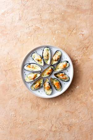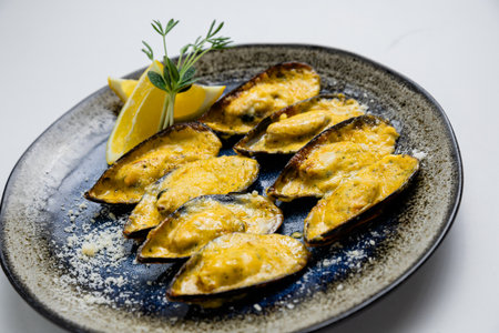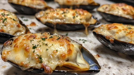 A tantalizing display of baked mussels topped with golden cheese, perfect for seafood lovers. Ideal as an appetizer or a gourmet meal option.