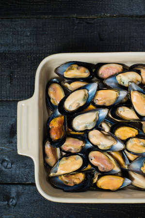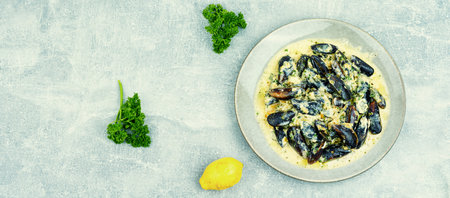 Cooked appetizing mussels in a creamy sauce.Copy space
