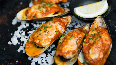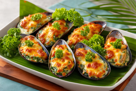 Delight in this mouthwatering plate of baked mussels topped with melted cheese and fresh herbs, perfect for any seafood lover seeking a gourmet treat.