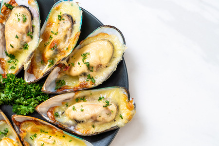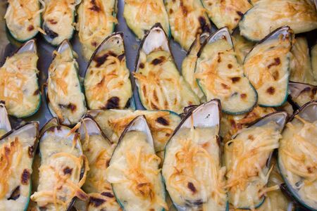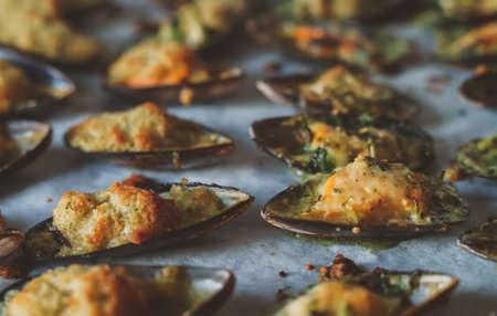 Baked mussels with cheese and herbs. Seafood. Healthy eating