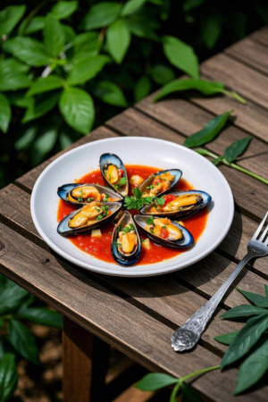 AI Generated. New Zealand Kiwi Mussels with Spicy Mayo and Teriyaki Sauce