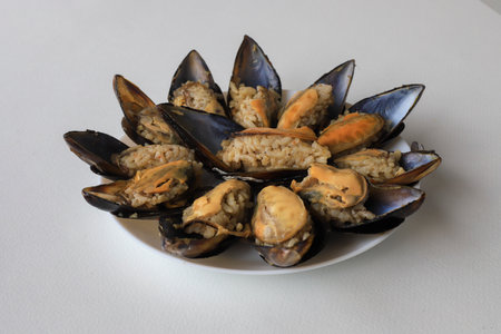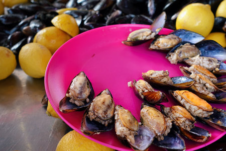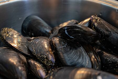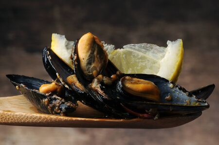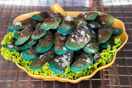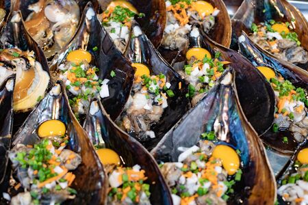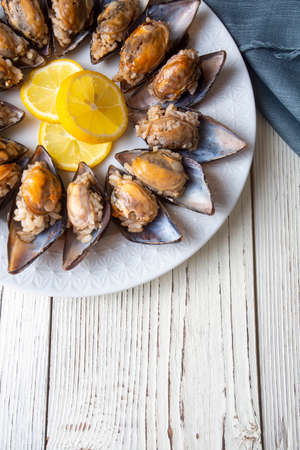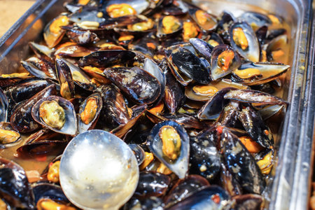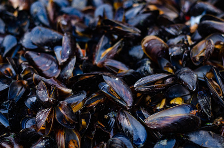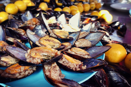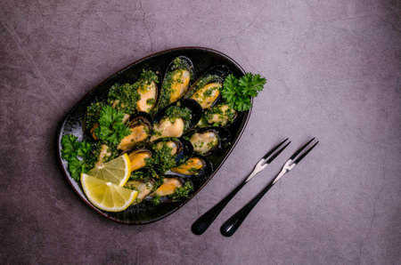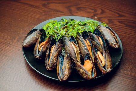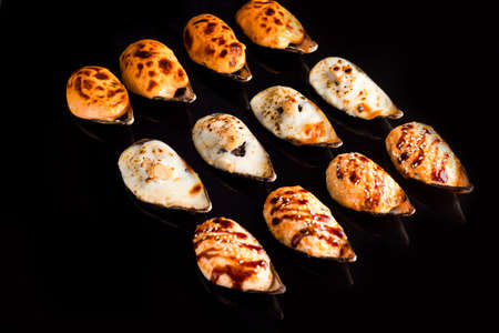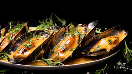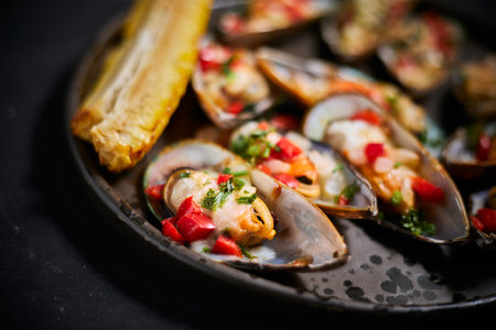 black and white exotic Healthy mollusk food is tasty appetizer at luxurious restaurant, delicious mussel as traditional sea cuisine, pacific ocean dish