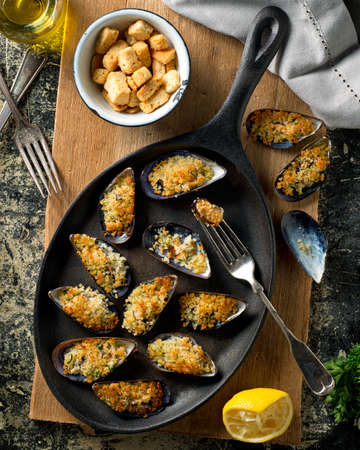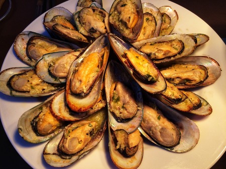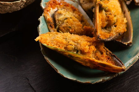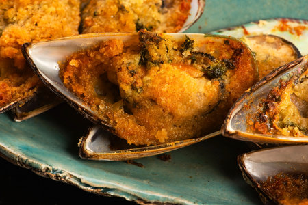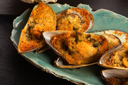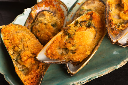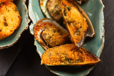 Baked New Zealand Mussels with Garlic Butter and Breadcrumbs on Handmade Ceramic Plate