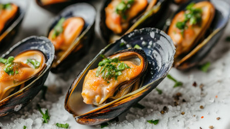 Explore a visually appealing arrangement of fresh mussels presented on sea salt, highlighting culinary artistry. Perfect for food lovers and chefs.