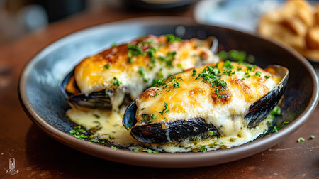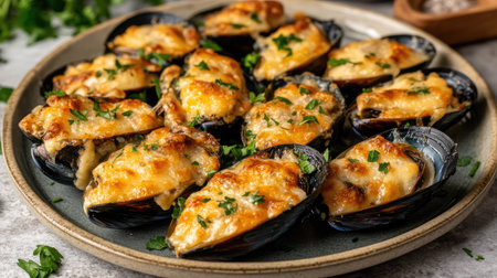 A delectable plate of baked mussels topped with melted cheese and fresh herbs, perfect for an elegant appetizer or a savory main dish. Enjoy the rich flavors!