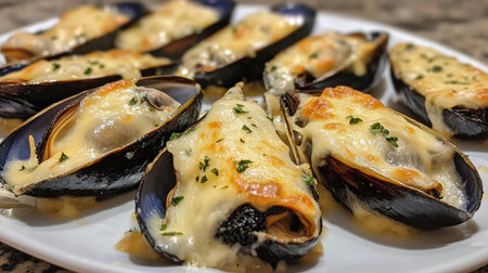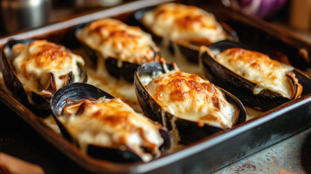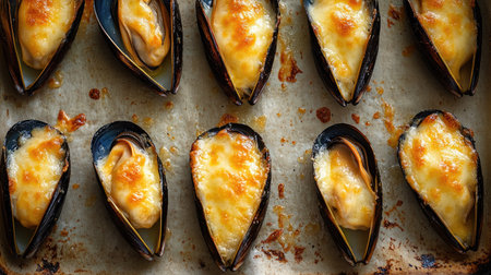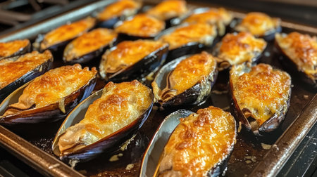 A tantalizing tray of baked mussels topped with melted cheese, showcasing a perfect blend of flavors and textures, ideal for seafood lovers and gourmet cuisine.