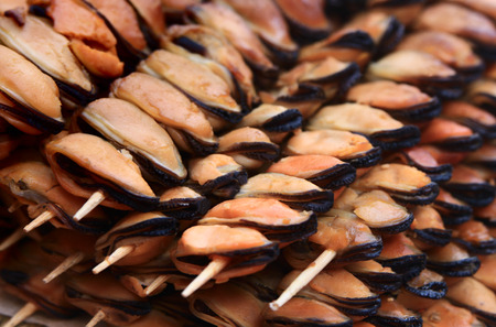 Midye dolma, stuffed mussels close-up, traditional Turkish street food food taken in Istanbul