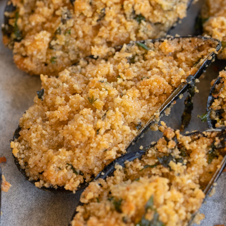 A close-up view of delicious baked mussels topped with cheese, garnished with fresh herbs. Perfect for a gourmet seafood dish or appetizer.