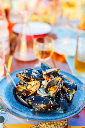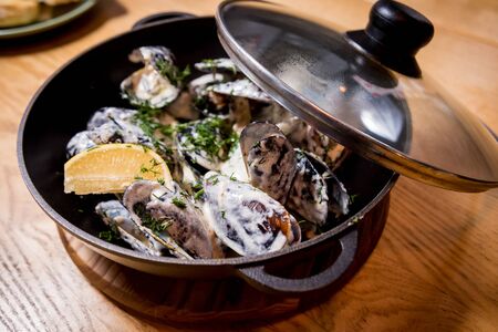 Mussels with garlic white sauce in a bowl. Restaurant. Background