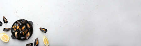 Seafood. The delicious, cooked mussels on a grey stone background. Minimalism in food photography. Border