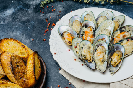 Baked green mussels with parmesan and garlic croutons on a white plate on a dark background