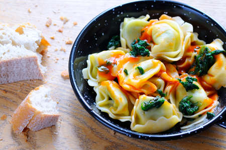 Ravioli with tomato sauce, spinach and parmesan cheese. Healthy eating. Vegetarian food. Italian cuisine