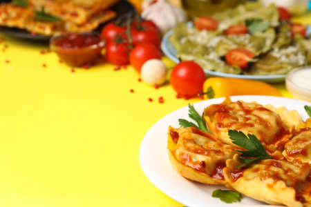Delicious food concept with ravioli on yellow background