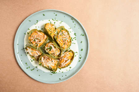 Pasta dish, spinach conchiglioni stuffed with pumpkin and chicken with parmesan cheese and green onions, healthy homemade meal. Image with copy space.