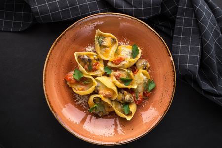 Delicious Conchiglie Giganti Pasta Shells with Meat, cherry tomatoes and cheese on black background top view