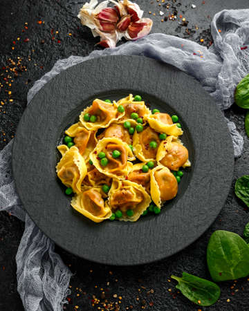 Italian pasta tortellini with flour and pepper in white plate on black wooden background, top view place for text
