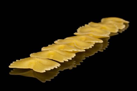 Lot of whole raw yellow pasta farfalle isolated on black glass
