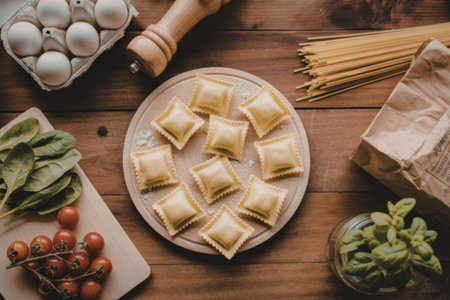 A plate of freshly prepared ravioli surrounded by various ingredients like eggs, spinach, cherry tomatoes, basil, and spaghetti on a wooden table.