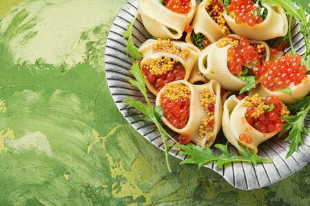 Festive, banquet pasta dish stuffed with red caviar.Macaroni stuffed with salmon caviar.