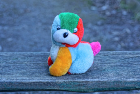 one small colored plush toy dog stands on a gray wooden table outside