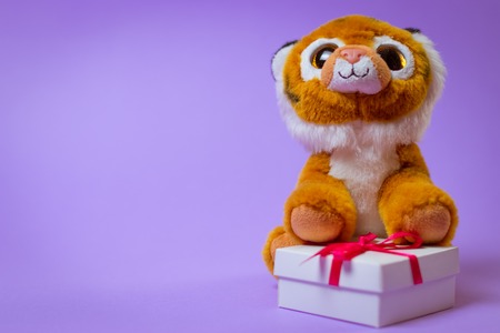 Toy Tiger sits on a white gift box with a Red Ribbon on a purple background.