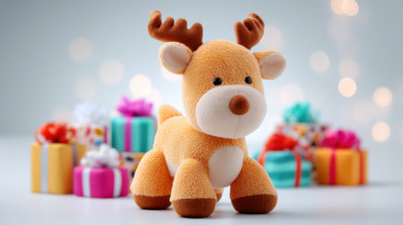 A charming plush reindeer toy with soft fur and adorable antlers stands in front of brightly wrapped gift boxes, evoking feelings of holiday joy and cheerful celebrations.