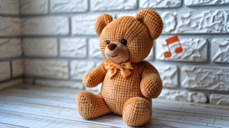 Cute brown teddy bear wearing yellow headphones sitting on a white brick wall background, with musical notes and music symbols in the concept for children's room decoration.