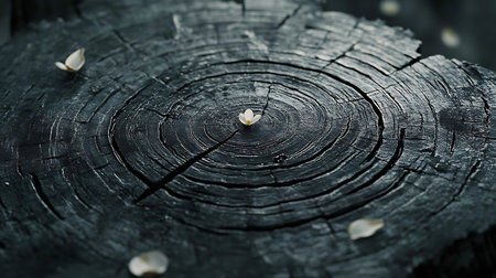 A small, delicate white flower contrasts with the dark, cracked surface of a burnt tree stump, symbolizing beauty, rebirth, and hope amidst desolation and charred wood.