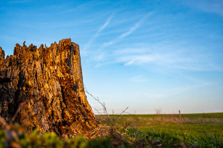 Beautiful landscape with old tree stump and blue sky with clouds.