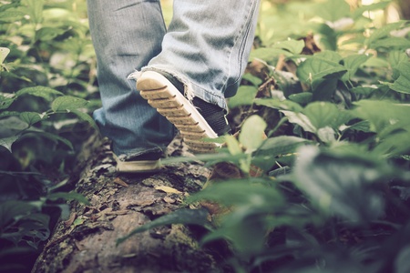 Close up woman walk in to the wild. Travel adventure and freedom concept.Woman walking outdoors, shoes closeup Vintage tone filter effect.