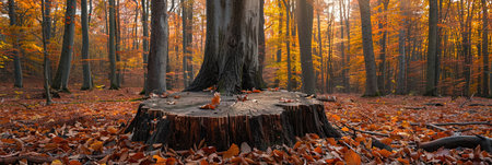 Forest stump with moss, surrounded by orange autumn leaves, in a serene, misty forest setting.