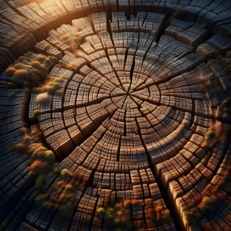 A close-up view of a tree stump reveals intricate grain patterns illuminated by warm sunset lighting, creating a peaceful and serene atmosphere in nature.