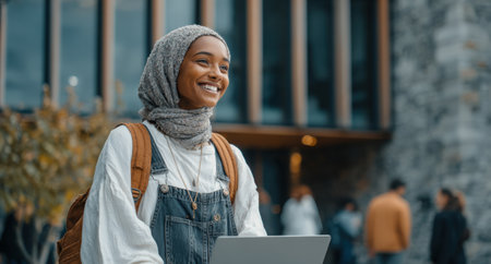 Female student in hijab is happily holding laptop outdoors, with modern building and peers in the background, illustrating a vibrant academic atmosphere