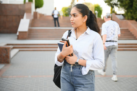 Portrait of Indian girl student with books near university.