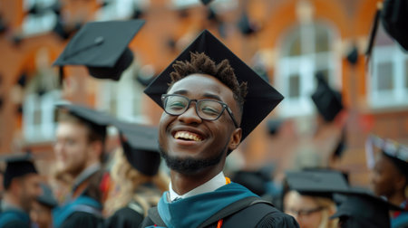 Happy African graduate celebrating at commencement ceremony, wearing traditional graduation gown and cap, with arms raised in joy amidst fellow graduates.
