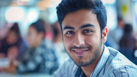 Handsome young Indian man wearing casual clothes and smiling while standing in front of crowd of people