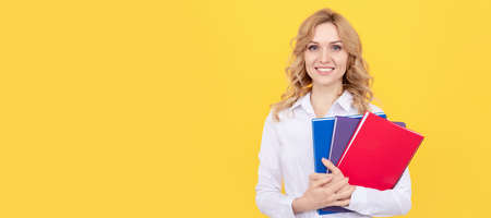 Business woman with book. Woman isolated face portrait, banner with mock up copy space. office worker with notebook. corporate fashion. business casual style. girl hold notepad.