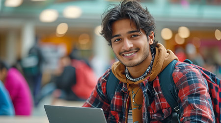 Indian freelancer or student working on laptop at co working space with vibrant atmosphere